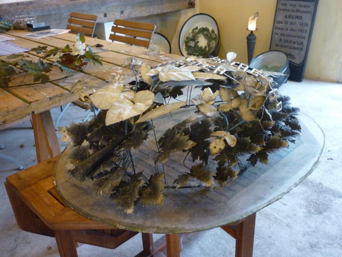 Met de kransen is het vaak niet beter gesteld. De metalen bladeren en bloemen werden met ijzerdraad op een metalen ring bevestigd. Dit ijzerdraad werd niet verzinkt of gegalvaniseerd, maar meestal omwikkeld met papier of stof om de bladstengels en bloemstelen zo goed mogelijk na te bootsen.