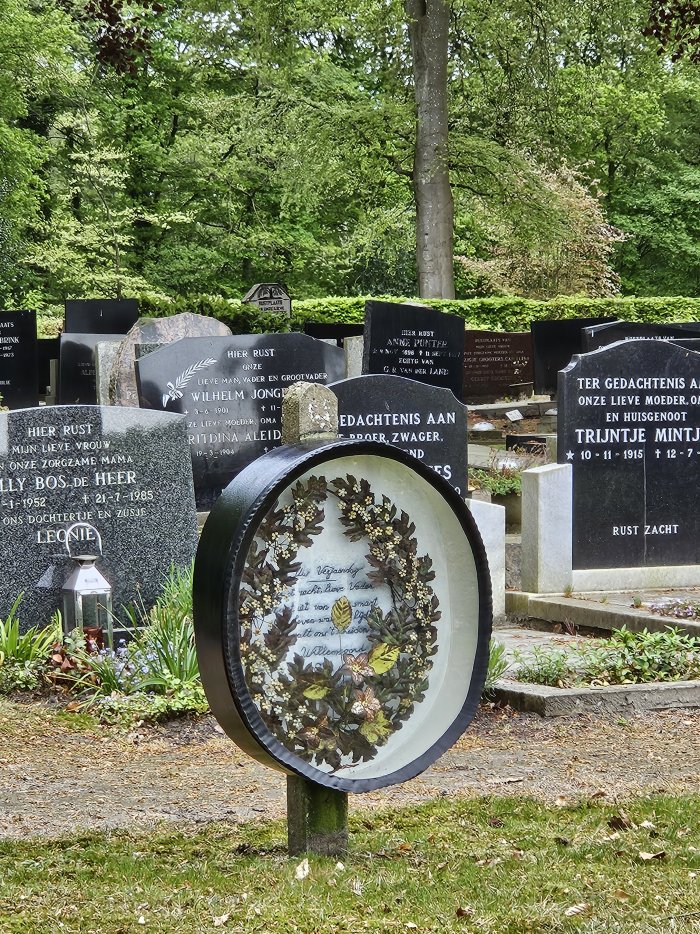 Krans rond, gerestaureerd en tegelijk op het graf geplaatst van Feije Jans met de trommel en krans van Wullemina.