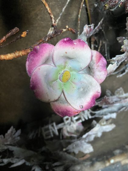 Beide kransen zijn van zink met enkele bloemen van porselein. Een van de kransen bevat zelfs twee viooltjes !