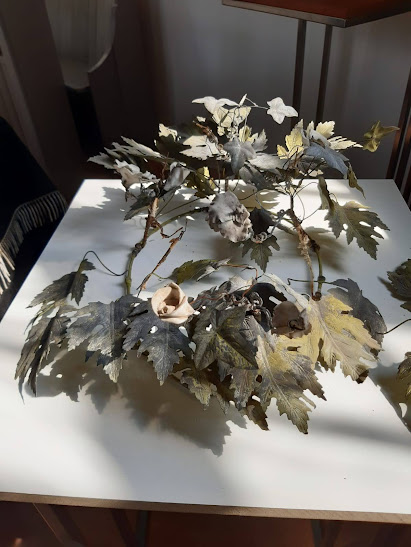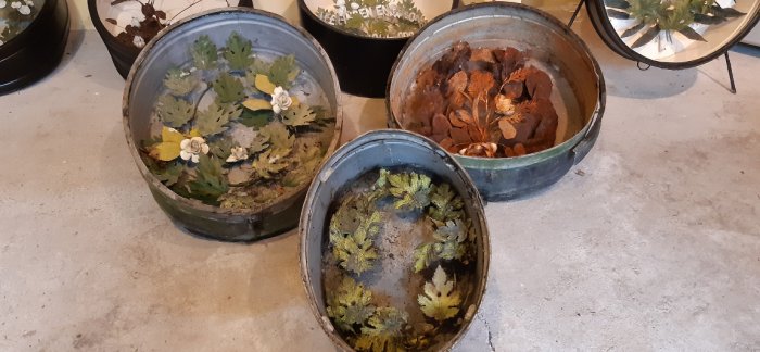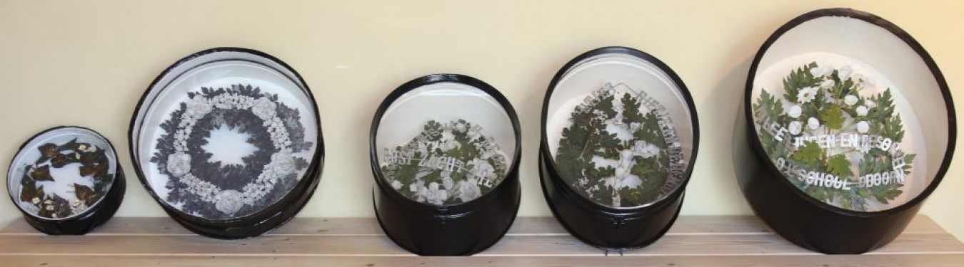 Er bleek dat in alle drie de trommels nog kransen zaten en niet eens zo slecht! Een krans kwam uit een Duitse fabriek dus daar waren de bladeren van blik met bijzondere bloemen, de andere twee kransen waren van zink.