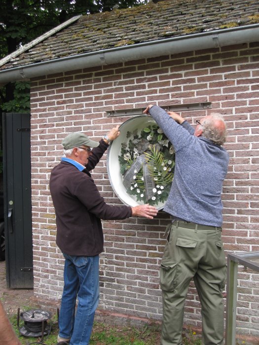 Krans rond, gerestaureerd en tegelijk op het graf geplaatst van Feije Jans met de trommel en krans van Wullemina.