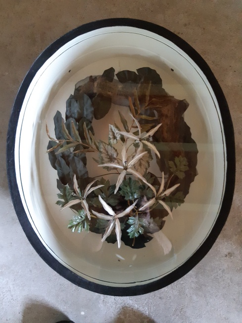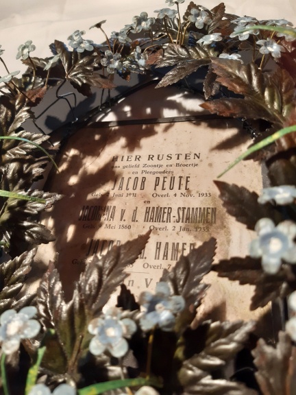 In de trommel van Marietje ligt een krans van eikenbladeren, wit, met daarbij nog een engeltje van steengoed en een ‘lint’ gezaagd uit zink en beschilderd.