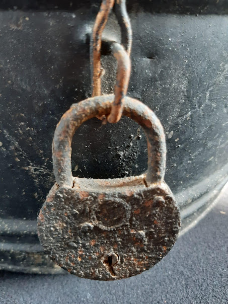 De graftrommel was in slechte staat, gesloten door een deksel met een prachtig authentiek slotje. Het glas van het deksel was stuk.