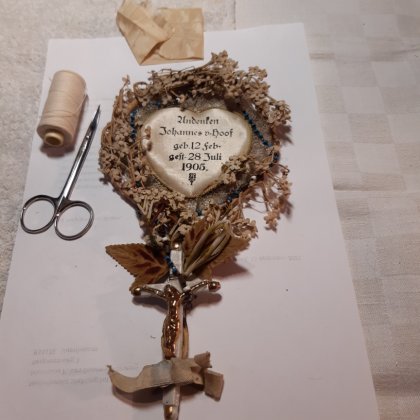 Ook is er een trommel met een krans van kaardenbollen, lint en fotootjes gevonden in Vlierbeek, België.