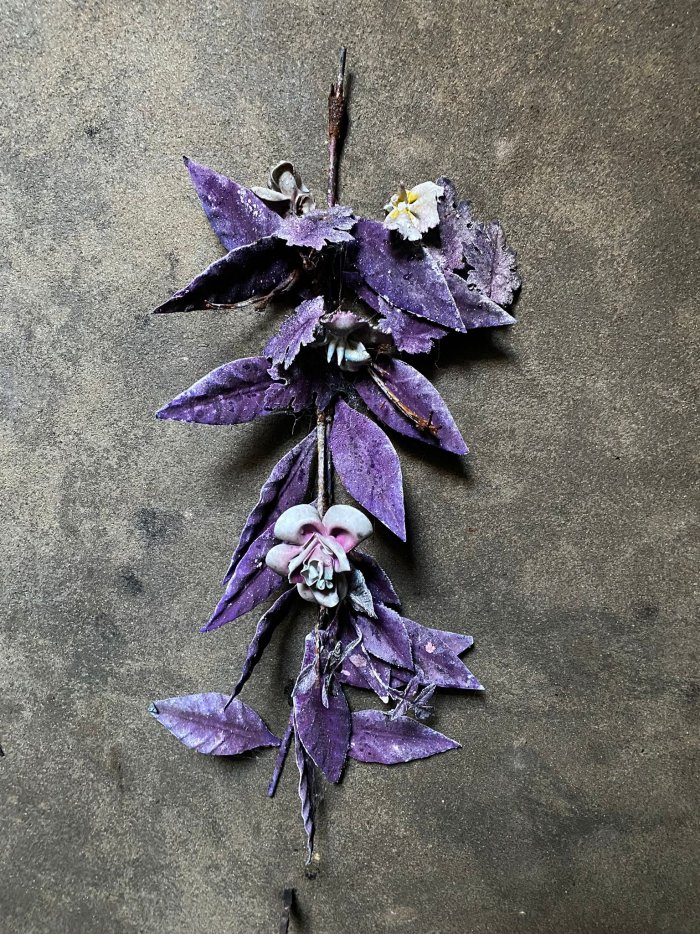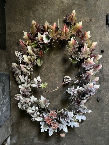 De kleur paars gebruikte men in de kralenkransen voor een overleden volwassen vrouw. Echter deze kleurstelling kwam zeer zelden voor in de metalen kransen! De krans van dit type, metalen blaadjes met porselein, werd rond 1920 geproduceerd in Frankrijk tot eind jaren dertig. In die periode werden de bladeren nog gespoten.