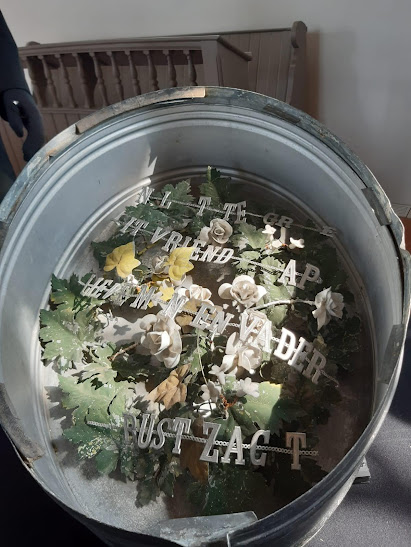 Er bleek dat in alle drie de trommels nog kransen zaten en niet eens zo slecht! Een krans kwam uit een Duitse fabriek dus daar waren de bladeren van blik met bijzondere bloemen, de andere twee kransen waren van zink.